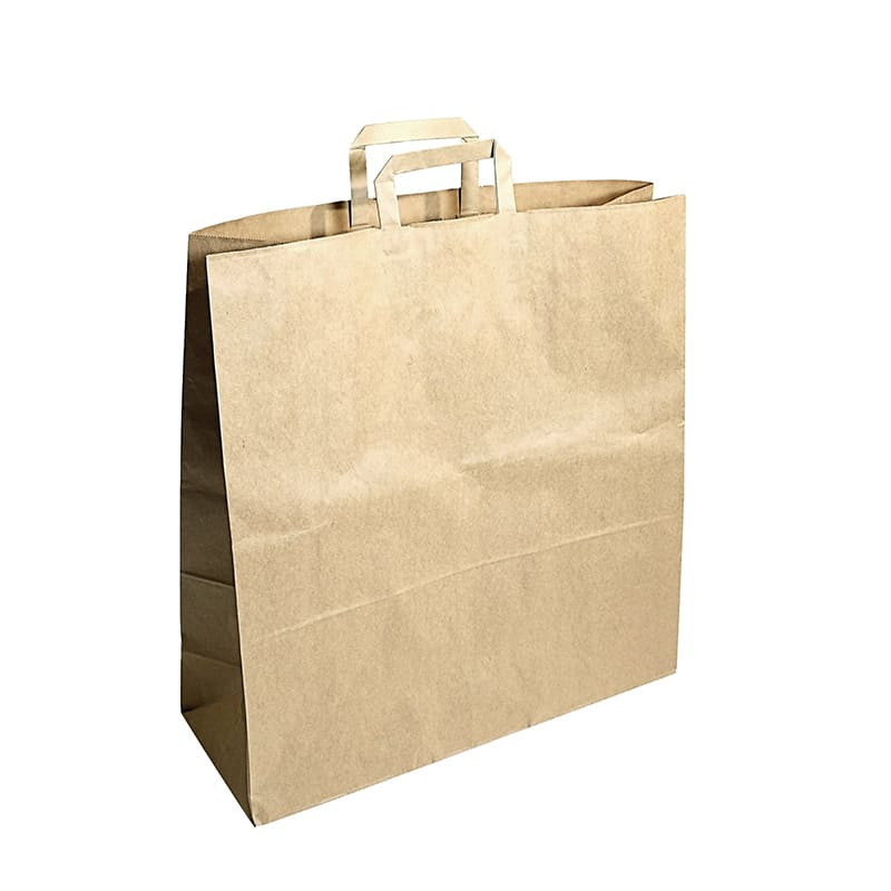 Sac Papier Kraft couleur écru avec poignées plates parfait pour tous les commerces soucieux de valoriser leurs produits vendus. De couleur marron, pratique avec ses poignées plates et très résistant : Ce sac Kraft cumule les qualités. C'est le produit de substitution parfait aux sacs plastiques avec bretelles.