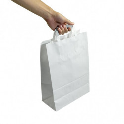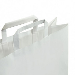 Sac Papier Kraft couleur blanc avec poignées plates parfait pour tous les commerces soucieux de valoriser leurs produits vendus. De couleur blanche, pratique avec ses poignées plates et très résistant : Ce sac Kraft cumule les qualités.